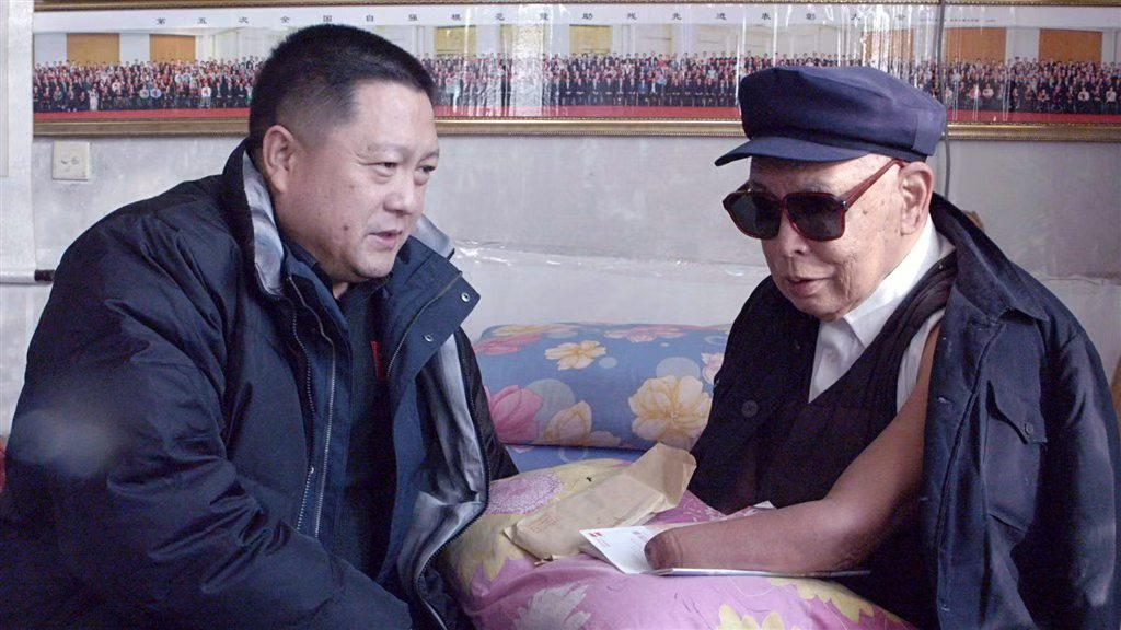 图为山东省齐鲁样板沂河源乡村振兴示范片区发起人、山东财经大学乡村振兴学院院长、东方汇泉金融控股集团董事局主席、北京东方君公益基金会会长董方军看望特等伤残军人朱彦夫