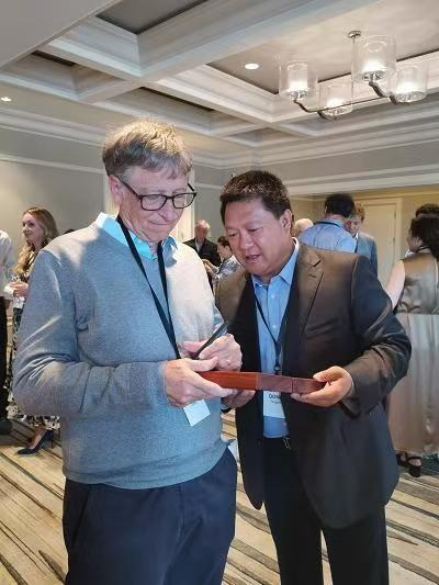 图为山东省齐鲁样板沂河源乡村振兴示范片区发起人、山东财经大学乡村振兴学院院长、东方汇泉金融控股集团董事局主席、北京东方君公益基金会会长董方军与比尔·盖茨先生交流