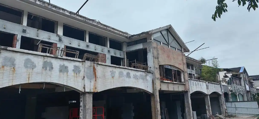 沉默的霓虹灯牌,紧闭的卷帘门,斑驳的墙面一一呈现在眼前。透过积满灰尘的玻璃窗,依稀可见昔日装修精致的店堂,桌椅散落,杂物堆积。这里,时间仿佛凝固在2024年6月19日——那个被强行切断水电的日子。