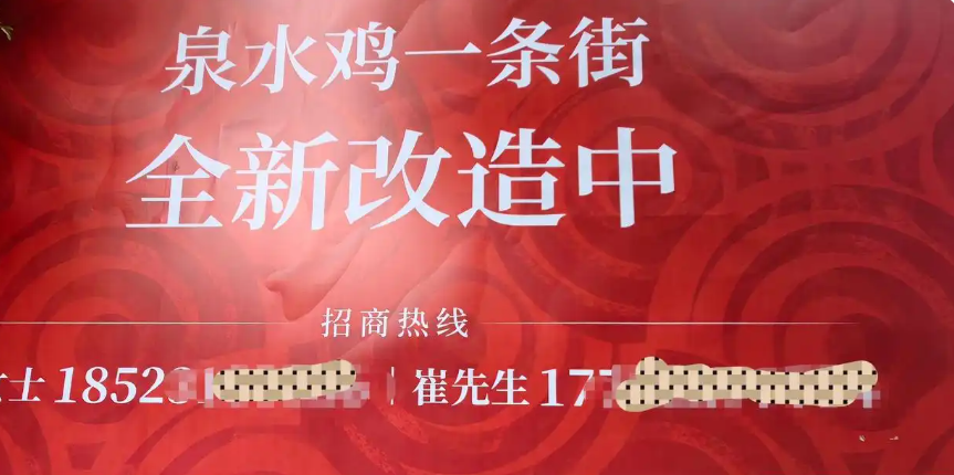 作者在紧挨重庆第二外国语学校的“高山流水广场”旁,看到立着一幅“泉水鸡一条街全新改造中”的巨幅广告,围墙上挂着多幅将要改造的房屋效果图。据知情人士介绍,这是力宏教育公司收购“高山流水风情商业街”后准备打造成“泉水鸡一条街”。