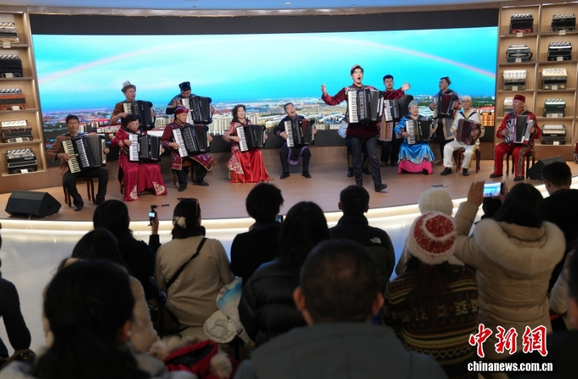 伊犁民族团结手风琴乐队在手风琴陈列馆为观众演奏。