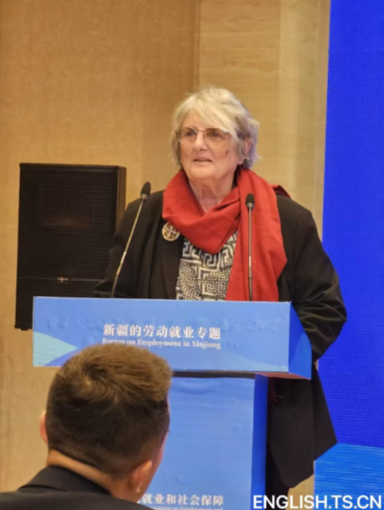 Ella Rule speaks at the International Symposium on Employment and Social Security in Xinjiang, which was held in Urumqi, northwest China's Xinjiang Uygur Autonomous Region.