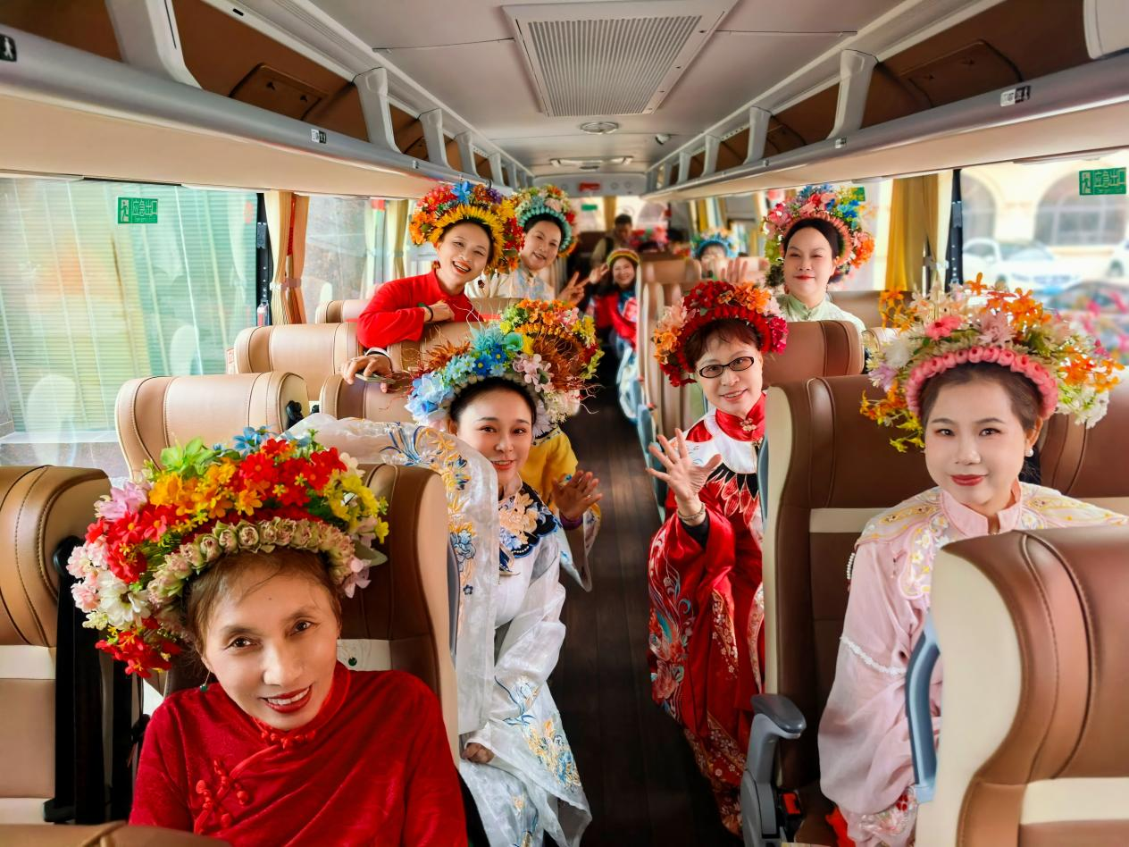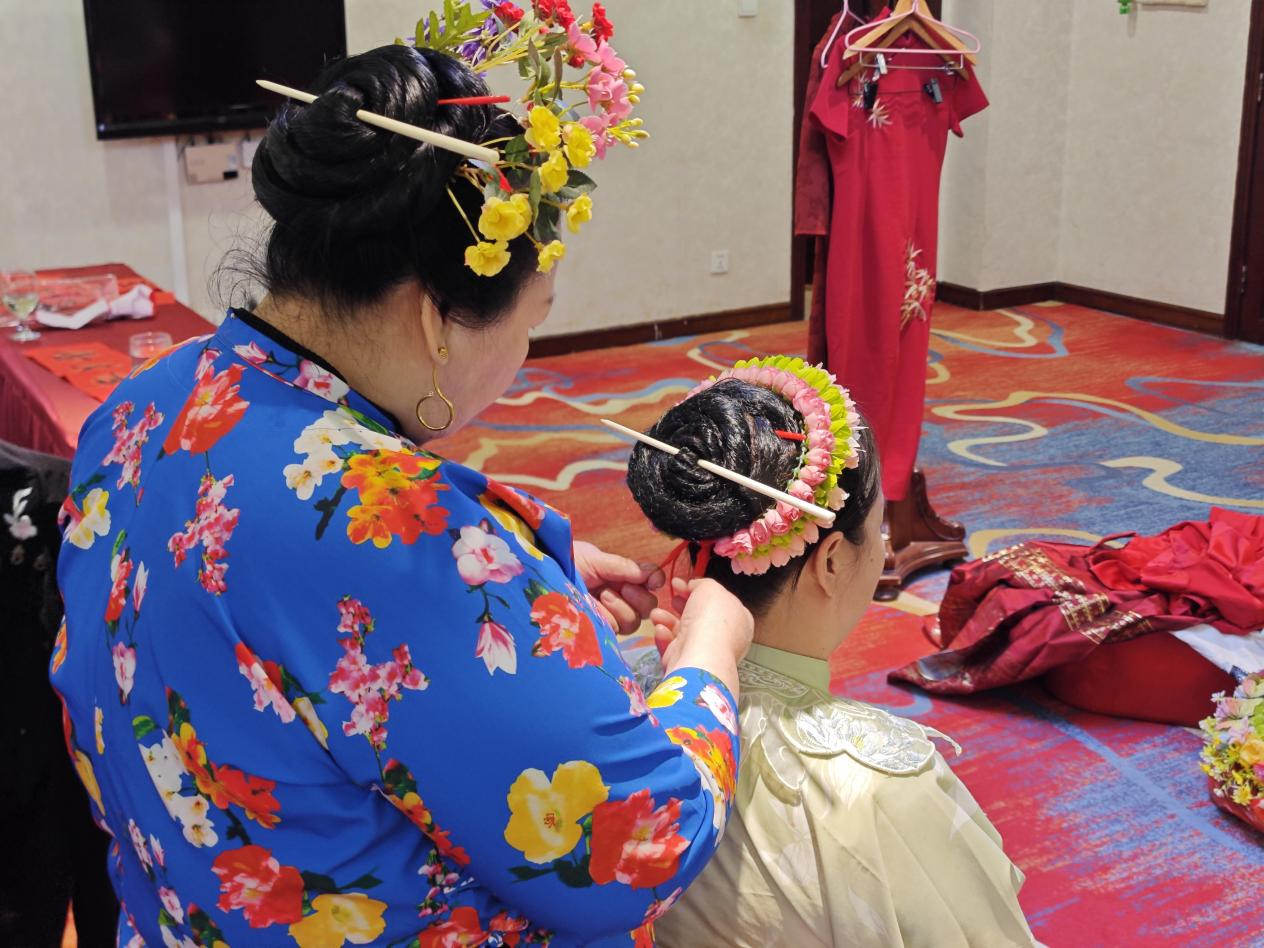 下午,嘉宾们在泉州酒店集中体验了簪花围。这一备受期待的项目点燃了现场的热情,大家主动向造型师沟通发型设计,并兴致勃勃地挑选汉服、马面裙等服饰。蟳埔渔女手巧地为女嘉宾盘发簪花,男嘉宾则佩戴上改良版簪花发箍。随着簪花完成,现场欢声笑语不断,众人纷纷拍照留念。