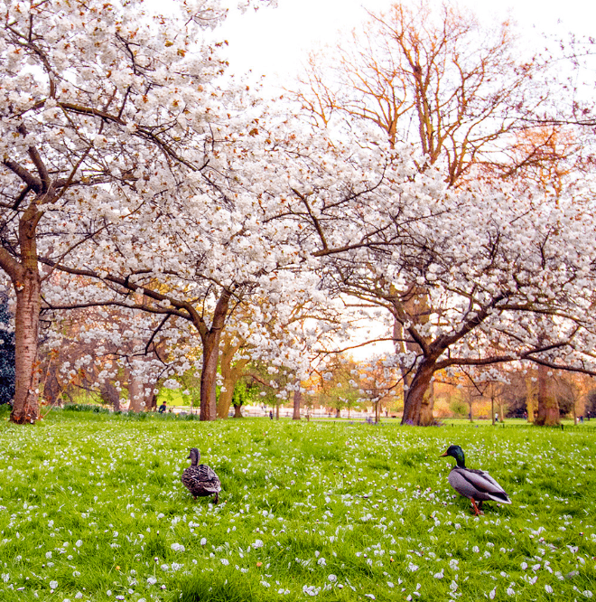 St James's Park 公园的粉白色吉野樱,可以说是全伦敦最温柔的樱花观赏点。这里的樱花树分布在Storey's Gate 和公园中湖的南岸,花瓣落入湖水简直美呆!