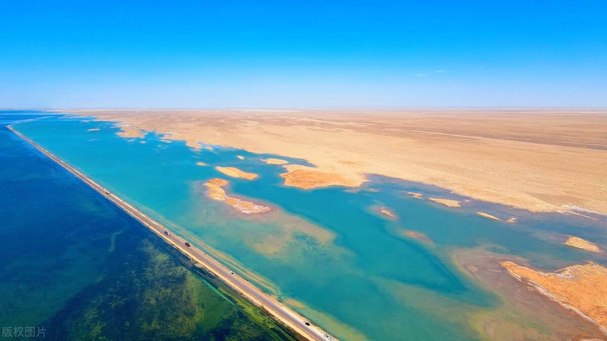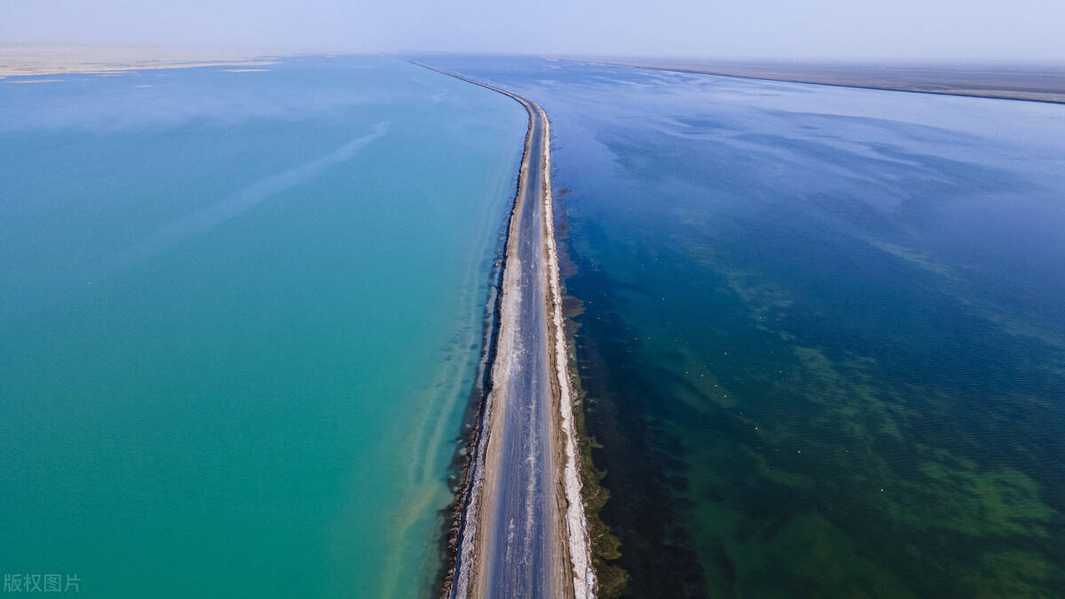 青海315国道从大柴旦往茫崖方向行驶,会经过西台吉乃尔湖。湖水被中间的公路一分为二,一侧因为含有丰富的铜离子呈现出翠绿色,另一侧因为含盐量较高呈现出深蓝色。