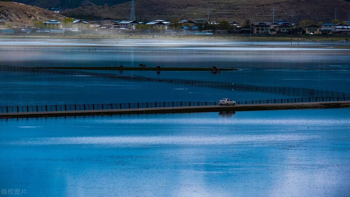 纳帕海的水山公路,需要等每年的夏季和秋季,一年之中湖水只在此停留一半的时间,另外一半时间湖水退去。这是一个草原湿地跟高原湖泊共生的生态系统,香格里拉进入雨季后,湖面上涨,盖过这条公路。