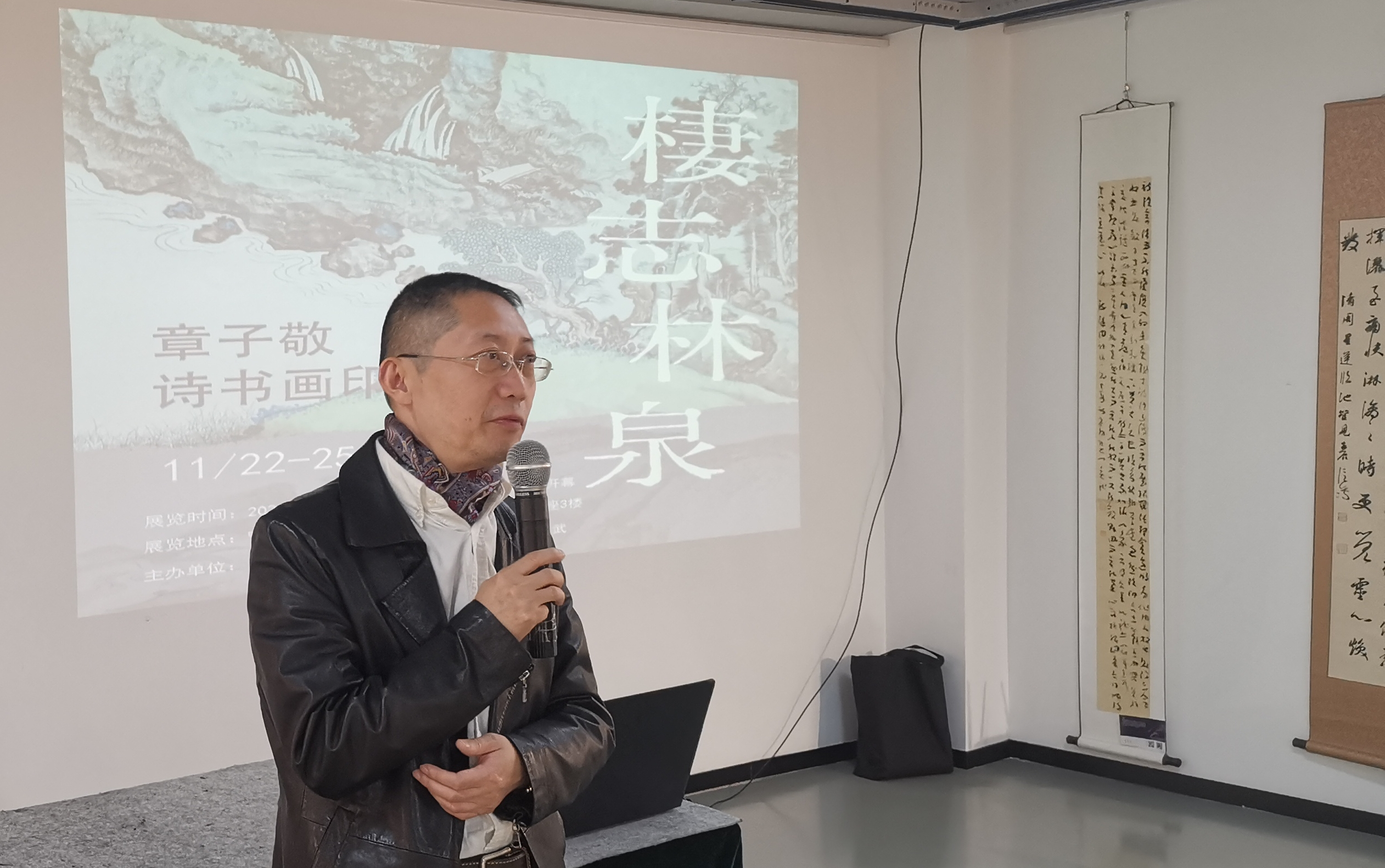 展览现场,沪上著名学者、书画家、篆刻家章子敬先生谦逊致辞,衷心感谢各位领导与朋友拨冗莅临。章子敬从国学中阐释了展览主题“栖志林泉”的文化内涵。这一主题,取意于北宋郭熙《林泉高致》中“林泉之心”,寄托庄子虚静之思。他与大家一起分享了自己的从艺经历:幼承家学,其父为著名画家陈丹青的启蒙老师,十二三岁时舍西画而专攻传统诗书画印,在父亲“此艺非仅笔墨,更需国学根基”的教诲下,从《左传》启蒙,修习至今。章子敬谦称自己“博涉未精”,表示此次展览“非为展示成就,而是立一新起点”,恳请诸位方家不吝赐教。