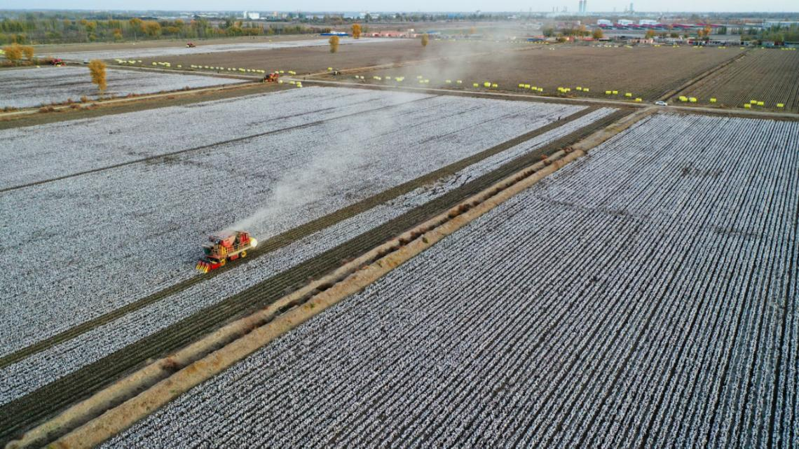 2024年在沙雅县塔里木乡高标准农田里采棉机来回穿梭采收棉花。程磊 摄