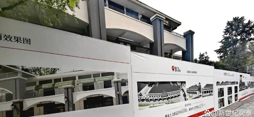 作者在紧挨重庆第二外国语学校的“高山流水广场”旁,看到立着一幅“泉水鸡一条街全新改造中”的巨幅广告,围墙上挂着多幅将要改造的房屋效果图。据知情人士介绍,这是力宏教育公司收购“高山流水风情商业街”后准备打造成“泉水鸡一条街”。