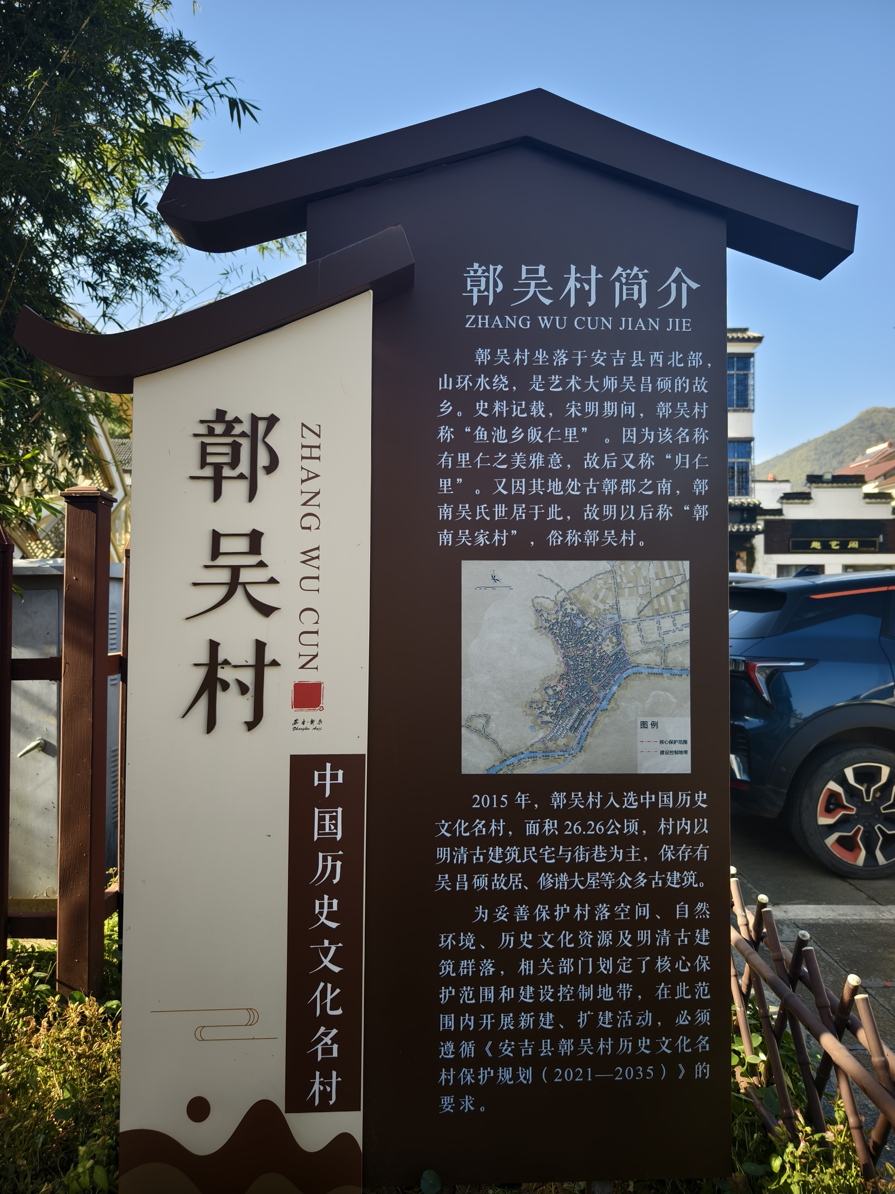 郭吴镇位于安吉县西北部,这座千年古镇人杰地灵,文化底蕴深厚。1844年,以“诗书画印”四绝称霸艺坛的一代宗师吴昌硕诞生于此。近年来,郭吴镇逐渐成为安吉县对外文化艺术交流的重要窗口,2015年被评为“中国最美历史文化小镇”。