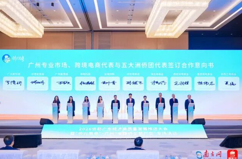 大会现场举行了2026“侨助广东经济高质量发展”十大重点项目签约仪式。此外,广州专业市场负责人与相关侨团代表签订合作意向书,广州跨境电商与海外侨团代表签订共建共享海外仓意向书。